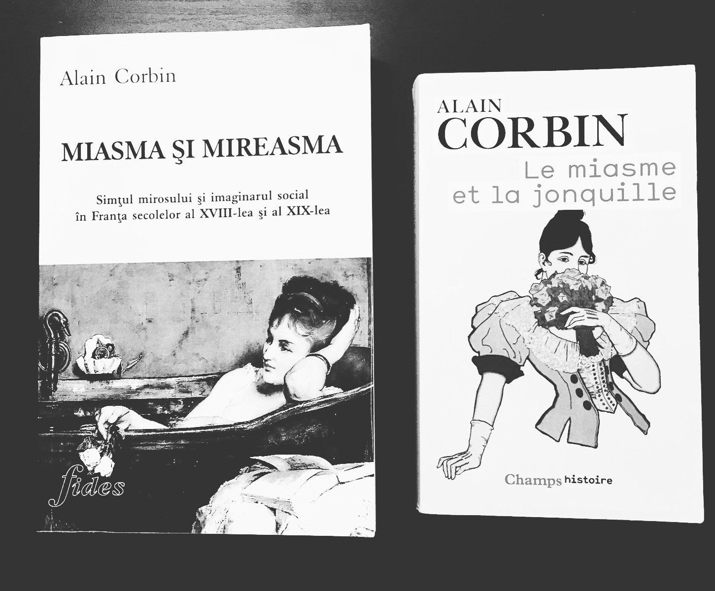 Din lista de lecturi obligatorii a oricărui pasionat de cultura olfactivă nu trebuie să lipsească importanta carte a lui Alain Corbin, Le Miasme et la Jonquille. L’odorat et l’imaginaire social, XVIIIe-XIXe siècles, publicată la Flammarion, în 1982. Studiul lui Corbin, care are ca punct de plecare istoria sensibilă, măruntă, a gesturilor cotidiene, dar și a presupozițiilor lor teoretice, este o lectură esențială pentru înțelegerea imaginarului și a deprinderilor contemporane privind olfacția, contribuind decisiv la completarea golurilor din istoria mare, de vreme ce insuflă viață acolo unde cifrele și datele acoperă o realitate sensibilă. Pentru o privire de ansamblu a temelor abordate de Alain Corbin în această carte, cel mai indicat este capitolul final, în care autorul expune pe scurt tranzițiile care s-au petrecut la nivel conceptual și practic, în ceea ce privește olfacția, în secolele XVIII-XIX.